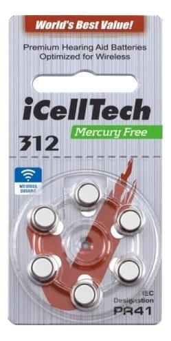 iCellTech 312 PR41 Zinc-luft knappcellsbatterier för hörselapparater, Kvicksilver-fri, 1,45V, 6-pack
