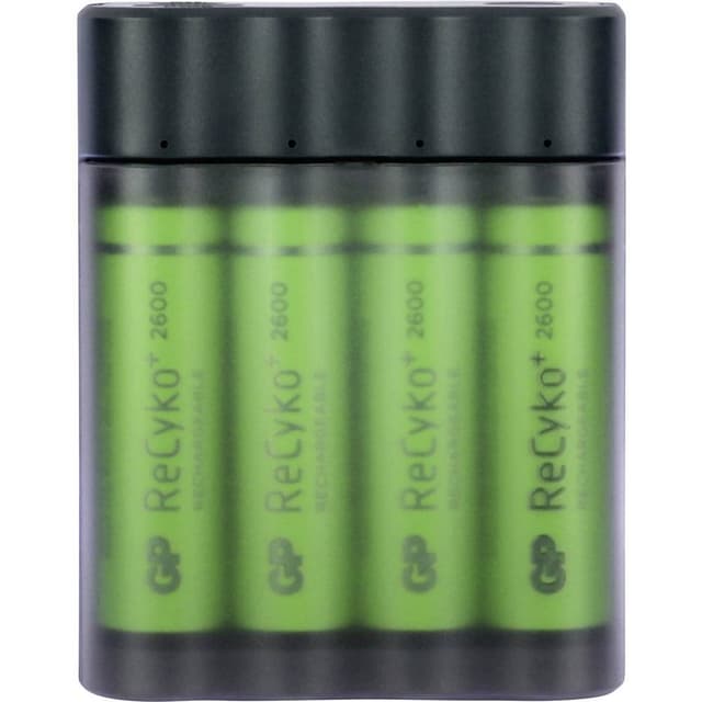 GP Batteries Charge Anyway X411 Batteriladdare NiMH inkl. batteri AAA (R03), AA (R6)Kan användas som Powerbank · USB-utgång · Minus-delat-U-avstängning · Batteri- eller batteriidentifiering · Övervakning av varje enskilt fack · Säkerhetstimer ·