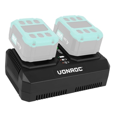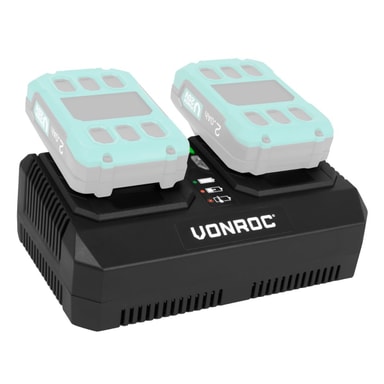 Ladda två VONROC VPower 20V-batterier samtidigt med denna kraftfulla dubbelladdare på 88W och 4.0A. Oavsett om du använder ett 2.0Ah eller 4.0Ah-batteri ser den höga effekten till att de snabbt är redo för användning igen – så du aldrig blir utan kraft länge.