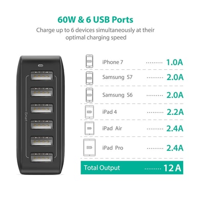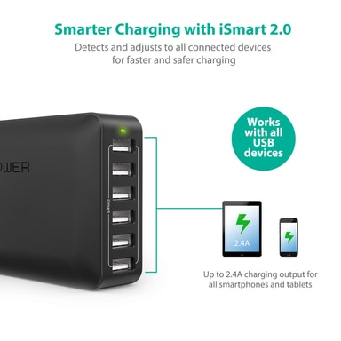 USB Hub från RAVPower med 6 USB-A-utgångar på varje 5V / 2A, så att hela familjen kan få ström på samma gång.Läs mer om produkten