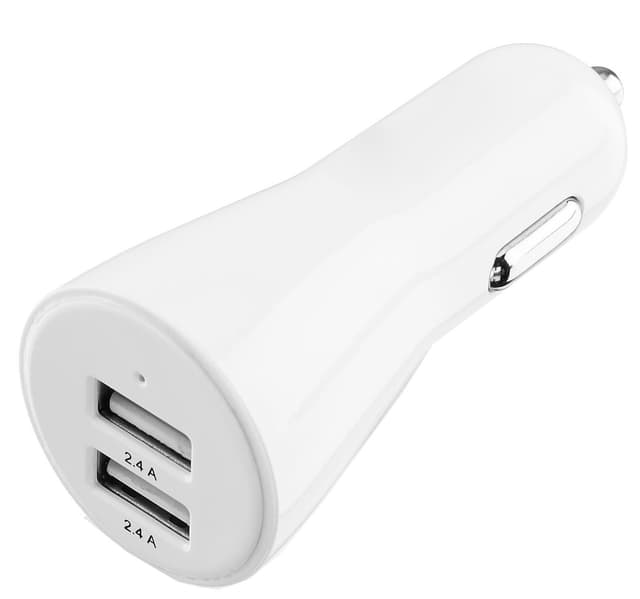 Billaddare med två uttag. Perfekt för att ladda två mobiler eller en mobil och en musikspelare samtidigt i bilen. Allt du behöver är två USB-kablar med rätt uttag i andra änden.