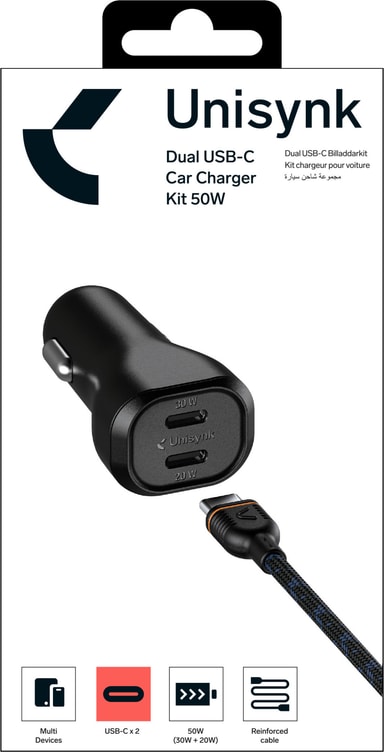 Unisynk 50W dual USB-C billaddare-kit erbjuder snabb dubbelladdning med 30W och 20W utgångar, universell kompatibilitet, och inkluderar en hållbar 1-meters flätad kabel för sömlös strömförsörjning.Läs mer om produkten