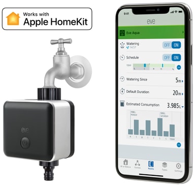Effektivisera ditt trädgårdsarbete med Eve Aqua smart vattenkontroll. Anslut den till en standard 3/4" vattenkran eller vattenslang och programmera in vilken tid som vattenspridaren ska vara av eller på. Vattenspridaren kontrolleras manuellt och tack vare vattenkontrollen får du en uppskattning av den totala vattenkonsumtionen allt via Eve-appen i din iPhone. Den stödjer också Siri röststyrning.
