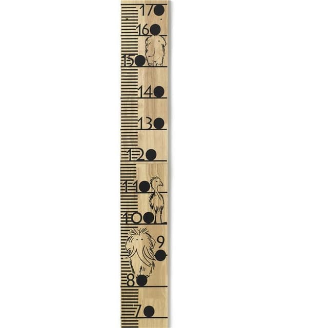 En mätsticka med fågeln Lisa och mammuten Neo. I de svarta cirklarna målade med griffelfärg. Kan du skriva in datum för att följa hur ditt barn växer.