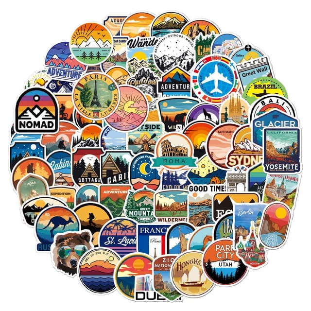 100 stycken vackra klistermärken med olika motiv med temat resor och äventyr. De är ca 6-8 cm stora och fäster på jämna ytor på t ex laptop, väskor, skåp, skateboard, cyklar och mycket mer. Dessa fina stickers är tillverkade av slitstarkt och vattentåligt PVC.