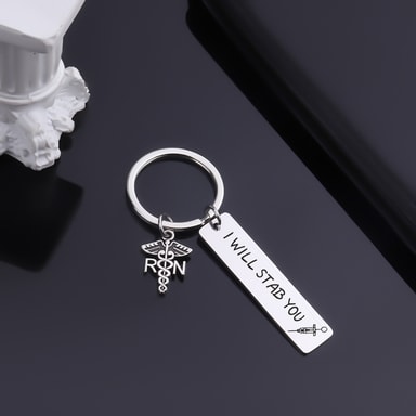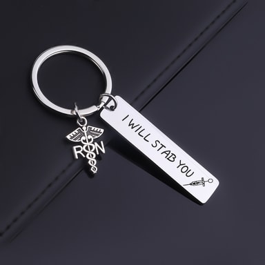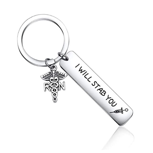 Den här nyckelringen är graverad ''Jag ska sticka dig'', som beskriver sjuksköterskors dagliga arbete i levande ord. Det är en perfekt present till dina vänner, familjemedlemmar eller dig själv som arbetar som sjuksköterska eller läkare. Tillverkad av förstklassigt rostfritt stål, denna nyckelring är motståndskraftig mot slitage, vilket säkerställer att den förblir en uppskattad accessoar i många år framöver.