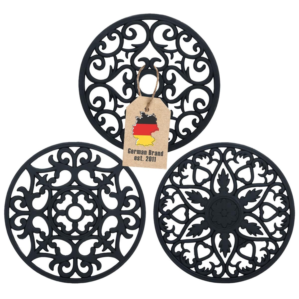 Vart och ett av de tre grytskydden har sitt eget ädla mönster, så att variationen garanteras. De vackra ornamenten gör också underläggen lämpliga som en dekorativ bas eller som en gåva när du flyttar in i ett nytt hem.