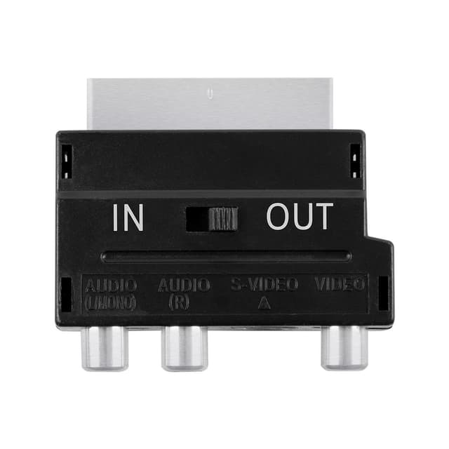Scartadapter med 3 RCA + 1 S-Video honor och in/ut omkopplare. För anslutning av enheter med RCA- eller S-Video-kontakter till en scartkontakt.
