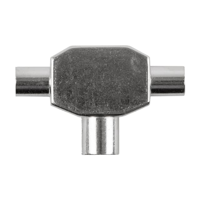T-koppling för antennkontakter. 2st hanar & 1st hona. Används t.ex. när man ska koppla in två TV-apparater till ett antennuttag. HF-tät, helt skärmat metallhölje för att minska störningar.