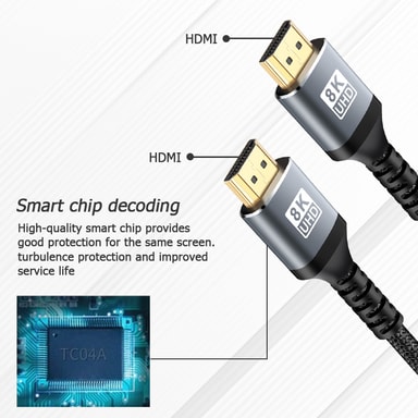 8K vid 60 Hz uppdateringsfrekvens: Den här HDMI-kabeln stöder en imponerande 8K@60Hz uppdateringsfrekvens, vilket säkerställer ultrasmidiga rörelser och minimerar fördröjningen vid spel, actionfyllda filmer och dynamiskt innehåll.