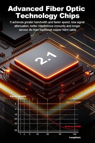 Aktiva optiska kablar med Silicon Line Chipset kräver ingen extern strömkälla för att konvertera och överföra elektriska signaler som optiska signaler och erbjuder många fördelar jämfört med konventionella kopparanslutningar. De är mycket lättare och mer flexibla än koppar för applikationer med hög bandbredd, har ett längre överföringsavstånd och ingen känslighet för elektromagnetisk störning (EMI). Fiberkabeln har samma standard HDMI-kontakter och det innebär att du kan koppla den som en vanlig HDMI-kabel till din TV och PC eller andra enheter. För att kunna klara vissa specifikationer som EDID och HDCP är kablen en hybrid av OM3 Multimode 4 leadre fiber och 7 ledars kopparkabel.Teknisk Information: