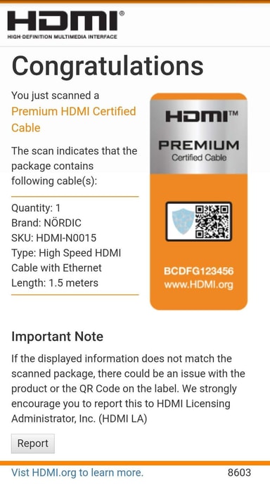 Denna NÖRDIC Premium High Speed HDMI with Ethernet är certifierad enligt med HDMI organisationenens PREMIUM HDMI CABLE CERTIFICATION POGRAM och det innebär att kabeln uppfyller alla tekniska specifikationer som defineras i programmet bl a upplösning upp till 4K i 60Hz, bandbredd upp till 18Gbps, stöd för 100Mbit/s Ethernet, HDR, upp till 32 separata ljudkanaler på vardera 48 kHz, Stöd för Dolby Vision Dolby Atmos och Audio Return Channel ARC, stöd för bildpropotionen 21:9, stöd för HDCP 2.2 och Dual View som innebär dubbla video signaler i samma kabel. NÖRDIC Certifierad Premium High Speed HDMI with Ethernet kabel är testat och godkänd av HDMI organisationens auktoriserad testlabb och varje kabel är märkt med en unik QR code som kan scannas för äkthetsverifiering. NÖRDIC HDMI-N0015 har stöd för 4K Ultra High Speed i 60Hz och bandbred på 18Gbps. Kabeln stöder Dynamic HDR och Dolby® Vision, perfekt för hemmabio- och spelapplikationer. Färger visas realistiskt med imponerande djup, ljusstyrka och kontrast reproduceras optimalt. Perfekt ljud med ARC-stöd som innebär att det okomprimerade ljudsignaler överförs direkt och förlustfri till anslutet ljudsystem via ljudåterföringskanalen.