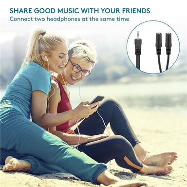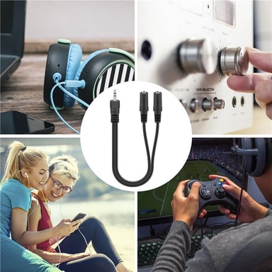 Delar upp ljudsignalen från en enhet till 2 separata utgångar, som var och en kan användas med hörlurar.
