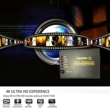 4K och många ljudformat: Denna HDMI switch har inte mindre än 5 ingångar och stödjer bildvisning i 3D och 4K Ultra HD samt ljudformaten LPCM, DTS, DTS-HD, Dolby Digital och Dolby True HD.
