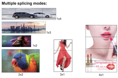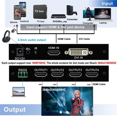 FunktionerDelar upp en full HD HDMI/DVI-signal till fyra videobildskärmsenheter (t.ex. bakre projektionsenhet, LCD-TV)Stöder flera skarvlägen: 2x2, 1x2, 2x1, 1x3, 3x1, 1x4, 4x1, samt 1x1-splitterläge180° skärmrotation och kantmaskering för korrekt visning, undviker bilddeformationHDMI-splitterfunktion: varje utgång kan visa hela originalresursenEnkel plug-and-play-installation, ingen drivrutin krävsAnti-statisk hårdvarudesign för säker och stabil användningAutomatisk 2x2-splicing-funktion för snabb och smidig installationFjärrkontroll för justering av skärmlägen, kantmaskning, ljusstyrka och kontrast