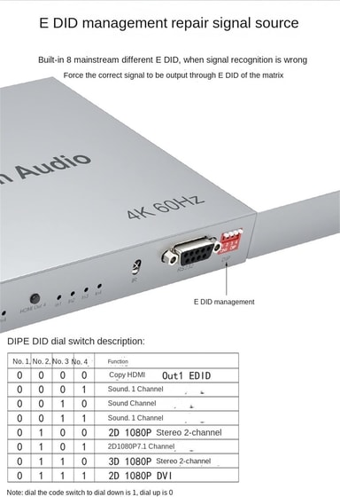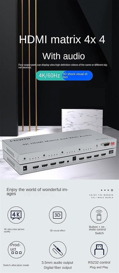 FunktionerFull 4x4 True Matrix-switch: växla eller duplicera valfri kombination av 4 källor till 4 skärmarSamtidig ljudutgång via 3,5 mm hörlursuttag och optisk portFlexibel EDID-hantering med 8 förinställda EDID-profiler för korrekt signalöverföringIR-fjärrkontroll och manuell knappstyrning för enkel switchingStöder RS232-kontroll för professionell integrationStabil, kompakt och pålitlig konstruktion i metallchassiLämplig för kontor, konferensrum, utbildning, säkerhet, data center och kommersiella miljöer