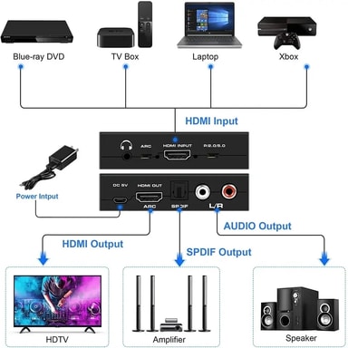 • Allows you extract the audio from a HDMI signal and feed it to a speaker system using older Toslink / RCA connections