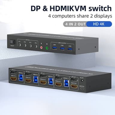 NÖRDIC KVM 4x2 Switch 4PC till Dual Monitor HDMI & DP 4K60Hz med 2x3.5mm och 3xUSB-A