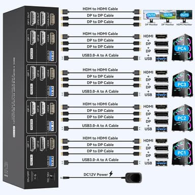 NÖRDIC KVM Switch för 4 datorer till 3 monitorer med 4xUSB 3.0, 2xDP och 1xHDMI – stödjer upp till 8K@30Hz och levereras med trådlös fjärrkontroll. Med denna KVM-switch kan du enkelt dela tre monitorer och upp till fyra USB-enheter mellan fyra datorer. Perfekt för dig som vill centralisera din arbetsplats, spara plats och växla smidigt mellan flera system.