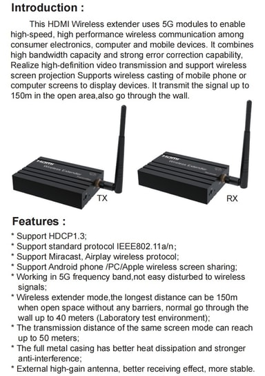 NÖRDIC Trådlös HDMI-förlängare 1080P Miracast 150 m möjliggör högupplöst trådlös videoöverföring från datorer, mobila enheter och konsumentelektronik till TV eller skärm. Den använder 5G-moduler för hög bandbredd och kraftfull felkorrigering, vilket ger stabil och snabb trådlös signalöverföring. Extendern stöder både trådlös skärmspegling via Miracast/AirPlay och traditionell trådlös HDMI-förlängning, med upp till 150 meters räckvidd i öppet område och upp till 40 meter genom väggar.