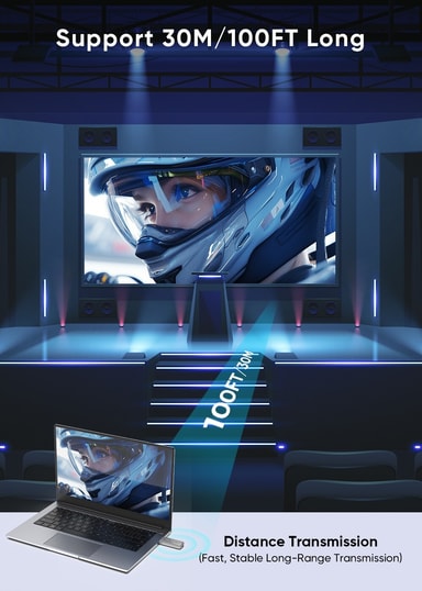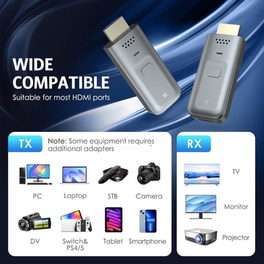Denna produkt är en trådlös HDMI-förlängare som gör det enkelt att överföra bild och ljud trådlöst från dator, mobil, surfplatta eller annan HDMI-källa till TV, skärm eller projektor. Med äkta plug-and-play-funktion krävs inga appar, inget Wi-Fi-nätverk och ingen Bluetooth-installation – anslut och börja dela innehåll på bara några sekunder. Lösningen är idealisk för hemmabio, mötesrum, utbildning och presentationer där kabeldragning är opraktisk.