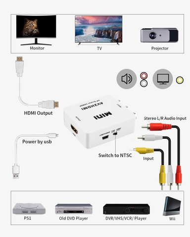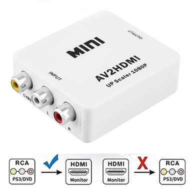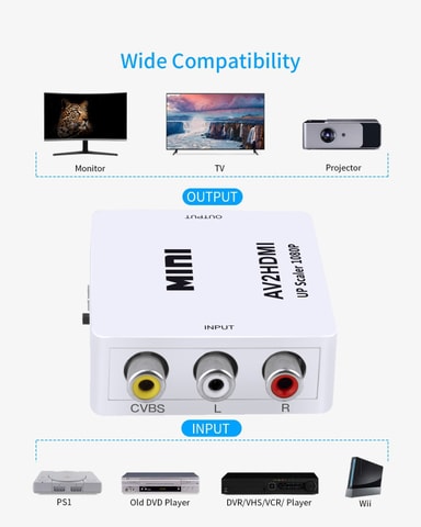 Stöder standardingångar: RCA till HDMI adaptern stöder standardingångssignaler som PAL, NTSC3.58, NTSC4.43, SECAM, PAL/M, PAL/N och kan användas till PC, PS2/3, Xbox, N64, Wii, NES, SENS, STB, VHS, VCR och DVD-spelare som har en standard AV-ingång.