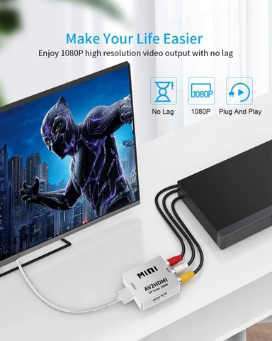 Plug & play: Det behövs ingen programvara utan det enda du behöver göra är att koppla i 3RCA-kontakterna (gul, vit, röd) och en HDMI-kabel från adaptern till skärmen samt ansluta den medföljande USB-kabeln till en strömkälla.