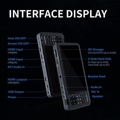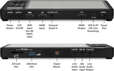 Denna produkt är en fristående HD-videoinspelningsbox med extra stor 7-tums LCD-skärm som gör det möjligt att spela in och digitalisera video från HDMI, VGA, YPbPr, AV (Composite) och S-Video. Den stöder 4K-ingång upp till 30 fps och spelar in i upp till 1080p 60 fps i MP4-format med H.264-kodning. Enheten fungerar helt utan dator och är idealisk för arkivering av VHS, VCR, DVD, Hi8, videokameror, spelkonsoler och andra analoga samt digitala videokällor, samtidigt som den även kan användas för live-streaming via PC.