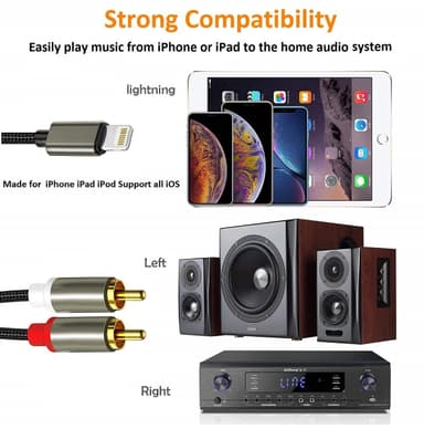 Denna kabel omvandlar gränssnittet från Lightning till RCA stereo och tillåter dig ansluta dina Lightning enheter som mobiler, surfplattor och datorer till din förstärkare, högtalare och A/V mottagare. Observera att kabeln endast är för ljud, ej video. Kompatibel med ett stort urval enheter med Lightning port och inga drivrutiner krävs. Guldpläterade kontakter med 2 meter lång nylonflätad kabel för det bästa ljudet och hållbar kabel.Specifikationer: