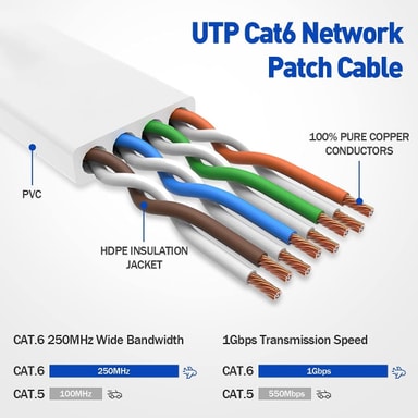 Flat oskärmad Cat6 U/UTP nätverkskabel med bandbredd på 250MHz och överföringshastighet upp till 10Gbps. Passar perfekt när kabel ska gömmas under mattan i hem eller kontor.