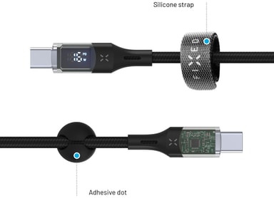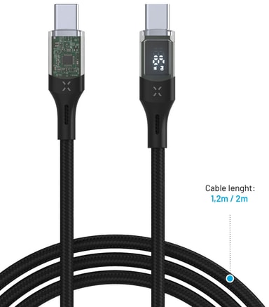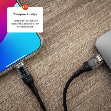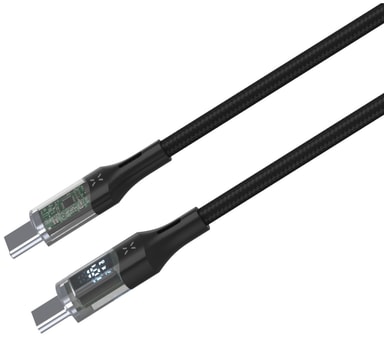 Fast 100W USB-C-laddkabel 2m erbjuder snabbladdning med Power Delivery 3.0, transparenta kontakter med LED-display, hållbar textilflätning och effektiv dataöverföring på 480Mbps, komplett med kabelorganiserare och dragrem.Läs mer om produkten