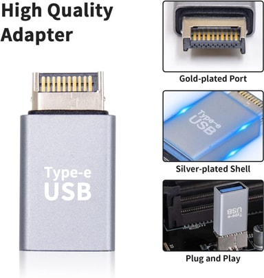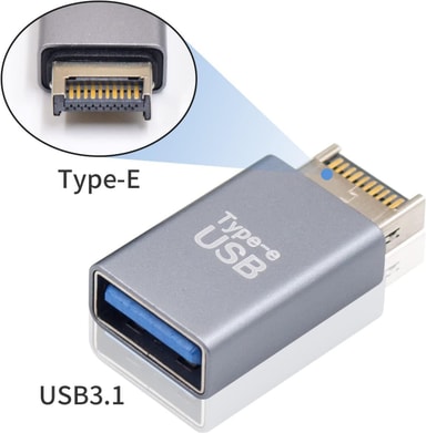 NÖRDIC Type-E hane till USB-A hona låter dig ansluta en USB-A 3.1 kabel till en USB Type-E port på ditt moderkort. Adaptern stöder dataöverföringshastigheter upp till 10 Gbps och 100W strömöverföring.