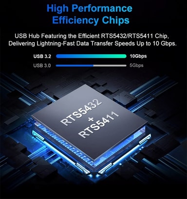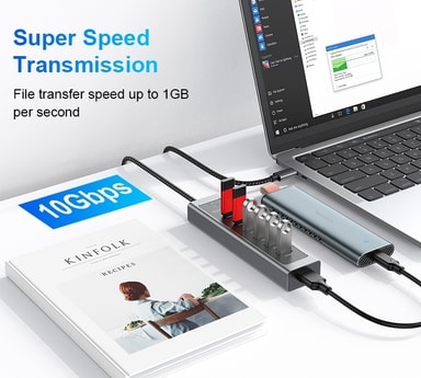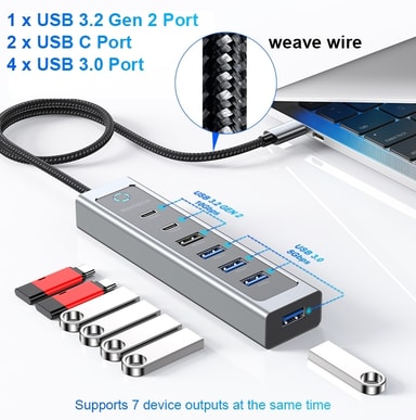 FunktionerUtöka din USB-C-port med totalt 7 extra portarStöd för dataöverföring upp till 10Gbps på utvalda portarStabil och snabb anslutning för externa hårddiskar, USB-minnen, tangentbord, mus och andra tillbehörSlitstark nylonflätad kabel för ökad hållbarhetElegant och tålig aluminiumdesign för effektiv värmeavledningPlug & Play – enkel installation utan drivrutiner