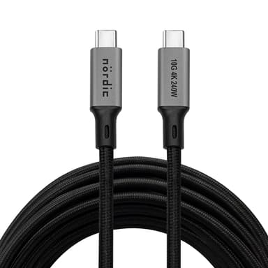 NÖRDIC USB 3.2 Gen 2 kabel har stöd för 10Gbps dataöverföring, 240W (48V 5A) Power Delivery och 4K video. Passar till alla bärbara datorer, stationärar datorer, macbooks, surfplattor och smartphones med stöd för USB-C eller Thunderbolt. Kompatibel med iPhone 15, MacBook Pro/Air, Samsung Galaxy och mycket mer. Kabeln levererar upp till 240W ström för att ladda en bärbar dator eller driva en skärm. Kompatibel med enheter med 240/200/180/140/100 och 60W.Specifikationer: