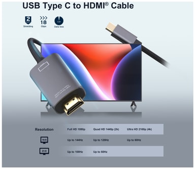 Sandstrøm USB-C till HDMI-kabel ansluter enkelt din USB-C-enhet till en 4K UHD-TV med guldpläterade kontakter, trippelskärmning för skydd mot störningar och stöd för upp till 18 Gbps bandbredd för sömlös, höghastig ljud- och videoöverföring.Läs mer om produkten