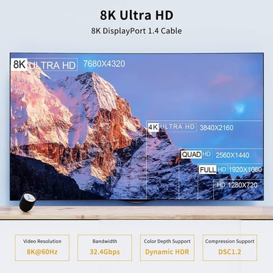 NÖRDIC DPDP-N2021 vinklad videokabel med hög kvalité för att kunna koppla en enhet med Displayport-utgång till en annan enhet 1m svart. Kabeln uppfyller alla krav i Displayport 1.4 standarden.