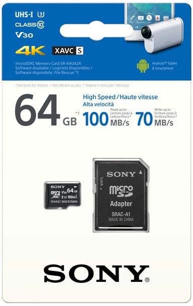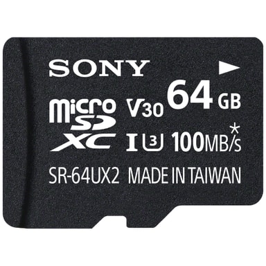 Micro SDXC-minneskort från Sony med kapacitet på 64 GB och ultrahög hastighet. Minneskortet kommer även med en fullskalig SD-adapter.