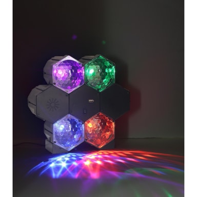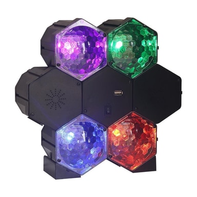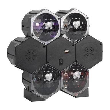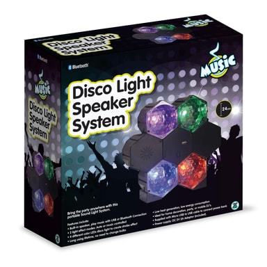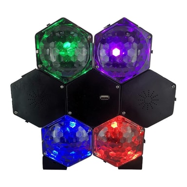 Ta med dig festen överallt med det här bärbara ljud- och ljussystemet! Systemet har inbyggda högtalare, där du kan spela upp musik via USB-kontakten eller Bluetooth. Det har också två ljuseffekter: auto eller musikkontroll. De 4 olika LED-ljusen lyser för att skapa en strobe-effekt. De håller i en livstid, så det behövs aldrig byta lamporna. Låg värmeproduktion, låg energiförbrukning. Perfekt att använda för att dekorera i hemmet, till en fest eller att ha som transportabel DJ.