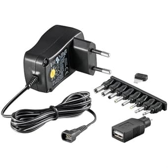 Nätadapter 230V till 3-12V DC Praktisk universal laddare för MP3-spelare, kameror, surfplattor mm. Switchad AC till DC-adapter för att t.ex. kunna ladda MP3-spelare eller annan utrustning. Man kan ställa in volten från 3 till 12V i fasta steg. Kontakt 1. Inner-/ytterdiameter: 0/2,5mm. Svart. Kontakt 2. Inner-/ytterdiameter: 0/3,5mm. Svart. Kontakt 3. Inner-/ytterdiameter: 1,35/3,5mm. Svart. Kontakt 4. Inner-/ytterdiameter: 1,7/4mm. Svart. Kontakt 5. Inner-/ytterdiameter: 2,1/5mm. Svart. Kontakt 6. Inner-/ytterdiameter: 1,5/5,5mm. Svart. Kontakt 7. Inner-/ytterdiameter: 2,1/5,5mm. Svart. Kontakt 8. Inner-/ytterdiameter: 2,5/5,5mm. Svart. Kontakt USB. Svart.