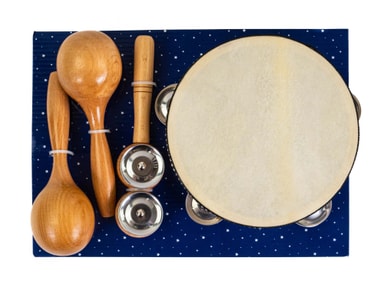 Vacker presentask med slaginstrument i trä för barnet, skolan eller dagis Trätamburin med skinn och tre par klockor Klockstång i trä Ett par...Läs mer om produkten