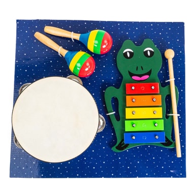 Färgglada slagverk för barn Klockspel med träfot och metallklubba, inkl klubba Trätamburin med skinn och tre par klockor Ett par maracas skramlar...Läs mer om produkten