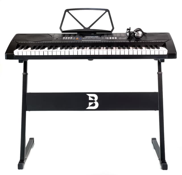 Bryce Music 61 keyboard keyboard - paket Komplett set med nybörjartangentbord, höjdjusterbart stativ och hörlurar. Stor ljudbank med många olika ljud. 61 beröringskänsliga plastknappar. Spela via de inbyggda högtalarna eller de medföljande hörlurarna. Kan spela rytmer som du kan spela med. Stativet kan justeras från 60cm till 90cm höjd. En skruvmejsel måste användas för att montera stativet. Inkl. nodhållare och strömförsörjning.