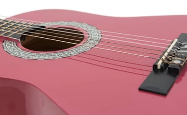 DiMavery AC-303 klassisk spansk gitarr, rosa. Storlek 1/2, ca. 5 - 7 år. Byggd av äkta trä. Gaboon, blackwood och limewood. Skala: 535 mm. Läs mer om produkten