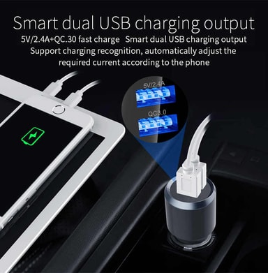 Dubbel billaddare: Med FM-sändaren får du även tillgång till dubbla USB-uttag för laddning av flera enheter, som till t ex två mobiler, samtidigt. Med 2 USB-portar förladdning, 5V 2.4A och QC3.0 snabbladdning.