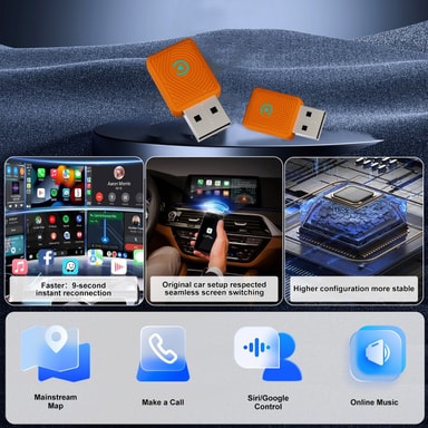 Smart anslutning i bilen: Förvandla ditt trådbundna CarPlay-system till en smart, trådlös hubb med denna adapter. Njut av sömlös integration med dina favoritappar, inklusive vanliga kartor för navigering, handsfree-samtal och röstassistentstyrning via Siri och Google. Streama online-musik direkt från din telefon till bilens ljudsystem. Adapterns 8 GB lagringsutrymme säkerställer smidig prestanda, medan dual-core-processorn hanterar flera uppgifter effektivt. Denna adapter är kompatibel med ett brett utbud av bilmodeller och huvudenheter som stöder trådbunden CarPlay, vilket erbjuder en betydande uppgradering av din underhållning och anslutning i bilen.