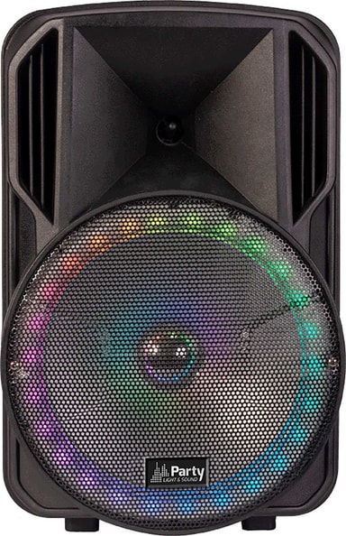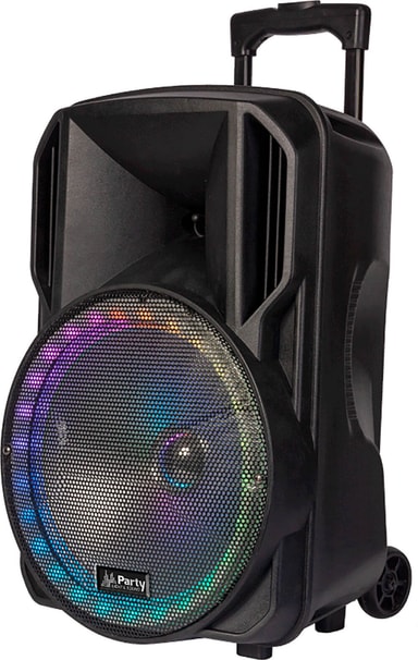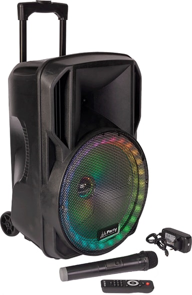 Inbyggt batteri.  LED-ljusshow i basenhet.  Spelar via Bluetooth.  USB-anslutning.  Trådlös mikrofon ingår.  Hjul och handtag för enkel transport. Läs mer om produkten