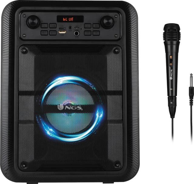 Kom i feststämning och njut av utmärkt ljud med NGR bärbar högtalare Roller Lingo, med LED-belysning, 7 timmars batteritid, flera anslutningsmöjligheter och inbyggd mikrofoningång för karaoke-sessioner.Läs mer om produkten