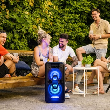 Kraftfull 200W-utgång med MaxxBass-teknik för enormt ljud och djup bas, ljuseffekter och equalizer för en förbättrad feststämning.