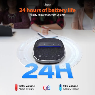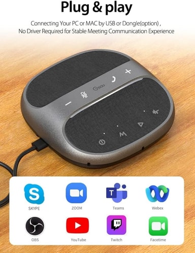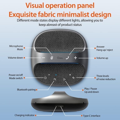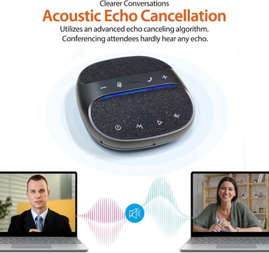 Funktioner360° röstupptagning med fyra mikrofoner, upp till 16 ft (ca 5 m) räckviddBrusreducering: Acoustic Echo Cancellation (AEC) och Noise Reduction (NR) för klar och störningsfri ljudöverföringAutomatisk volymbalansering för jämn ljudnivå oavsett avstånd till högtalarenPortabel med inbyggt batteri och USB-C laddningBluetooth 5.3 och USB-adapter för enkel anslutning och plug-and-play till PCIdealisk för konferenser, online-möten, podcasts, streaming, videospel och musiklyssning