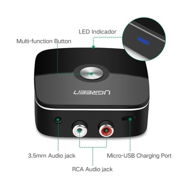 UGREEN Bluetooth ljudmottagare låter dig förvandla din traditionella högtalare till en trådlös ljudenhet genom att ansluta den här mottagaren till högtalaren. Denna produkt är en mottagare, men inte en sändare. 3,5 mm ljudgränssnitt och 2RCA kan inte fungera samtidigt.